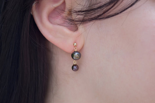 9ct Yellow Gold Black Tahitian Pearl Double Drops
