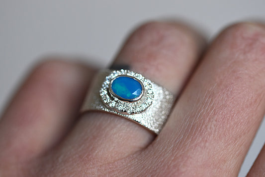 Paraiba Opal & Moissanite Diamond Halo Ring